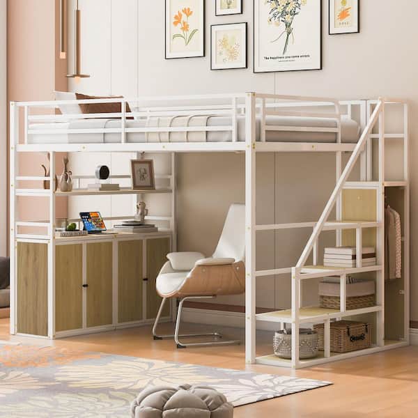 White Full Size Metal Loft Bed with Built-in Desk, Wardrobe, Lateral Storage Staircase, Shelves, Lockers