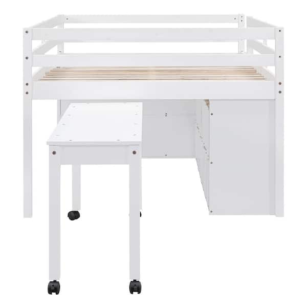 White Full Size Wood Low Loft Bed with Retractable Writing Desktop, 4 Open Compartments, 4-Drawer, Movable Desk
