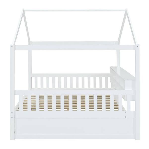 White Full Size Wooden House Bed with Multiple Storage Shelves, Mini Cabinet with Door