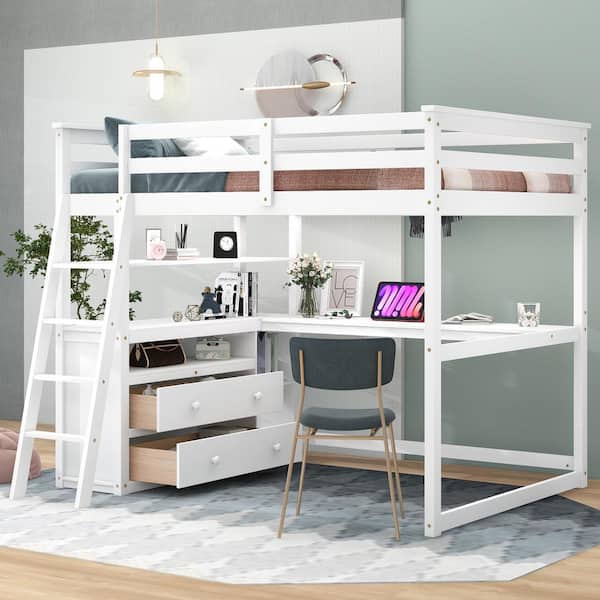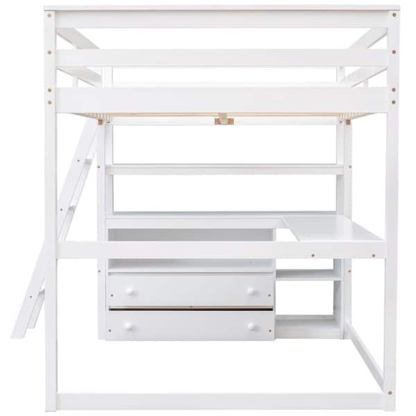 White Full Wooden Loft Bed with Built-in Desk, Shelves and Drawers