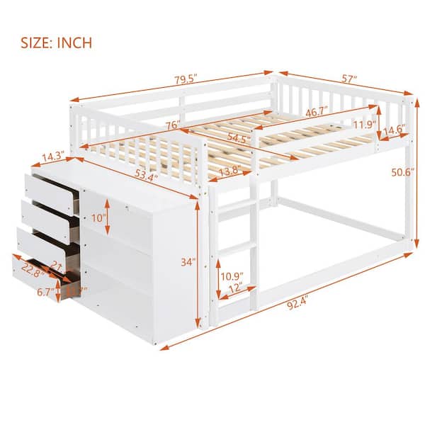 White Full over Full Wood Frame Bunk Bed with Cabinet Including 4 Drawers and 3 Shelves, Built-in Ladder