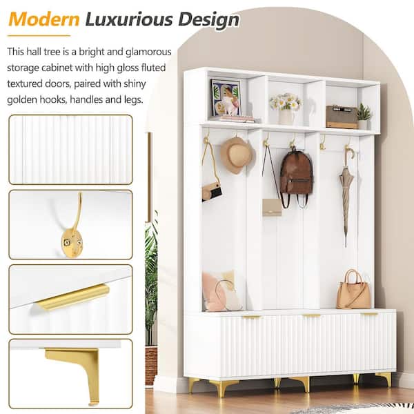 White Large Storage Modern Hall Tree with Bench, High Gloss Fluted Doors, 6 Luxurious Gold Hooks and Legs