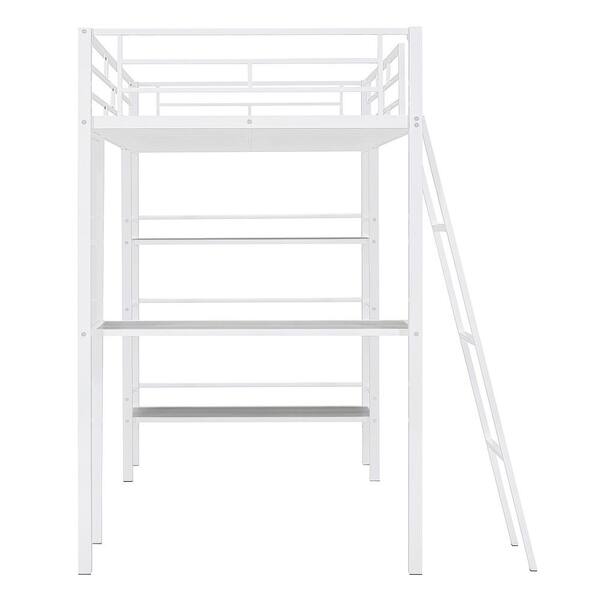 White Metal Twin Size Loft Bed with 3-Tier Shelves and Wood Desk, Whiteboard, Inclined Ladder