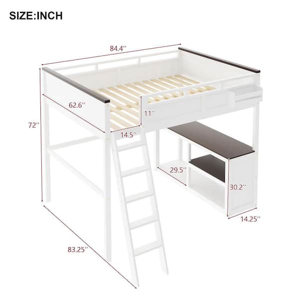 White Queen Size Wood Loft Bed with Built-in Desk, Open Shelf, USB Charging Station, and Ladder