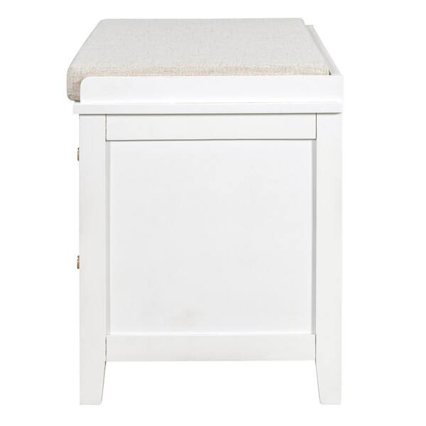White Storage Bench with Removable Beige Cushion, 2-Drawers, 2-Rattan Door 43.5 in. for Entryway, Bedroom, Living Room