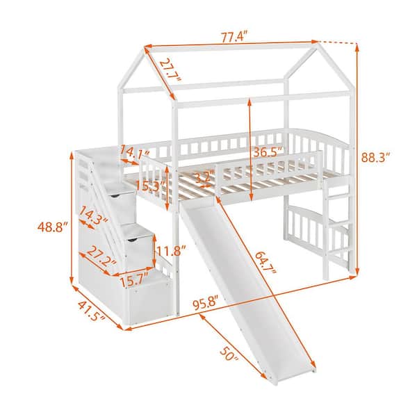 White Twin Size Loft Bed with Two Drawers and House Bed with Slide