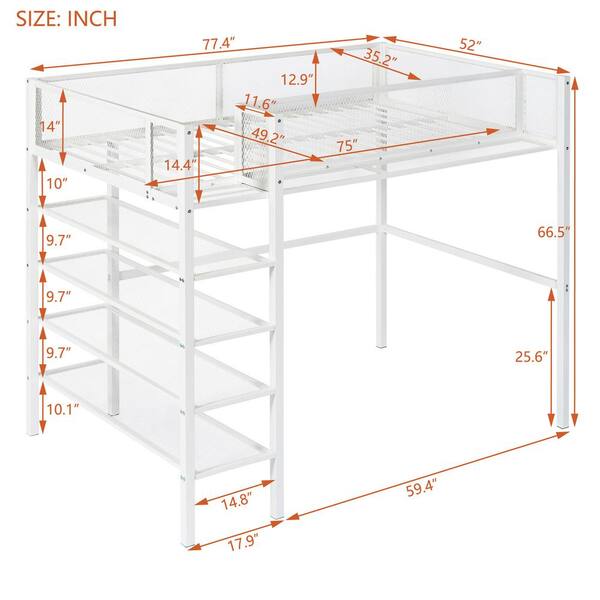 White Twin Size Metal Loft Bed with 4-Tier Shelves and Bedside Storage Shelve