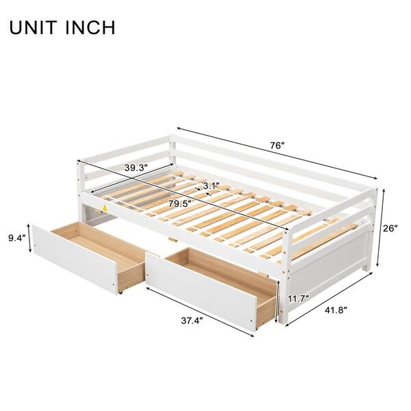 White Twin Size Wood Daybed with Two Storage Drawers and Bed Rails