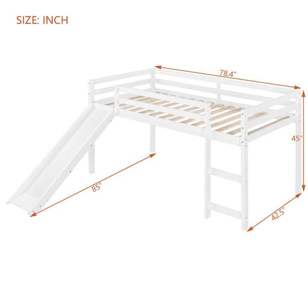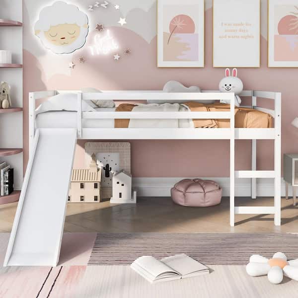 White Twin Size Wood Loft Bed with Slide and Ladder