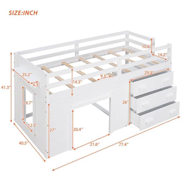 White Twin Size Wooden Loft Bed with Cabinet and Shelf