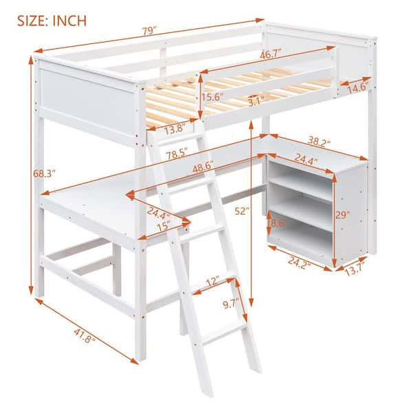 White Twin size Wooden Loft Bed with Shelves and Build-in Desk