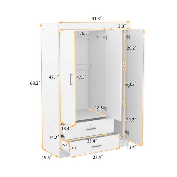 White Wood 41.3 in. 3-Door Wardrobe Armoires with Hanging Rod, 2-Drawers, and Storage Shelves