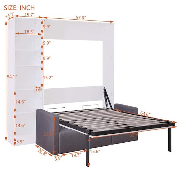 White Wood Frame Full Murphy Bed Wall Bed with Sofa and Storage Shelves
