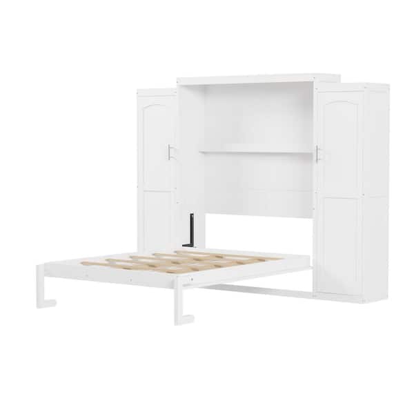 White Wood Frame Full Size Murphy Bed Wall Bed with Wardrobes, Storage Shelves