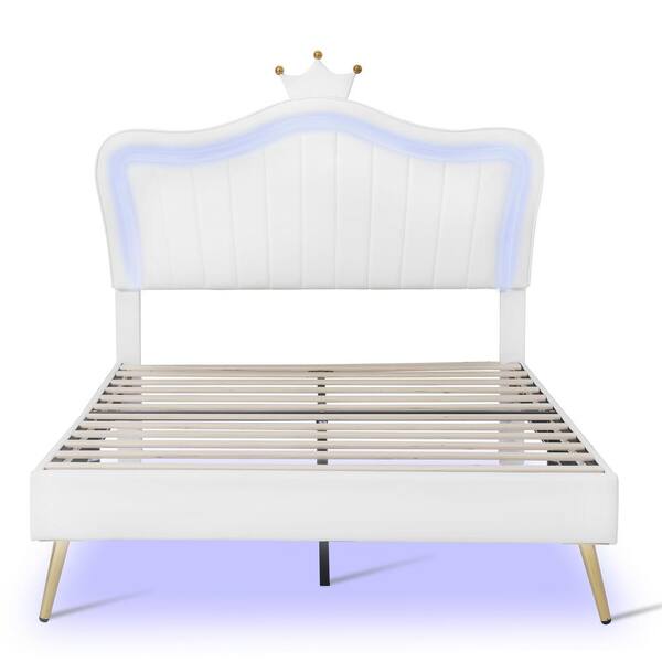 White Wood Frame Full Size PU Leather Upholstered Platform Bed with Princess Crown Headboard, LED Lights, Metal Legs