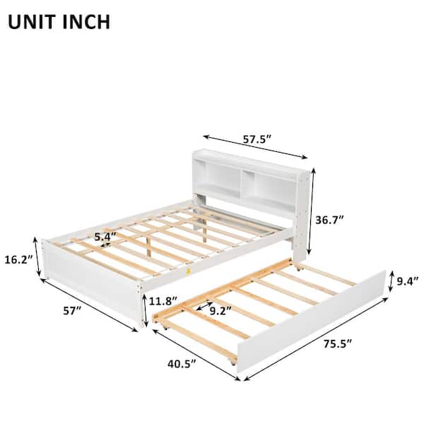 White Wood Frame Full Size Platform Bed with Trundle and Bookcase