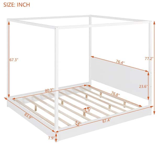 White Wood Frame King Size Canopy Bed with LED light and Support Slats