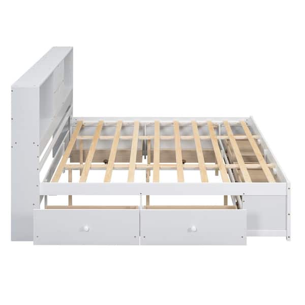 White Wood Frame King Size Platform Bed with 8 Drawers and Storage Headboard