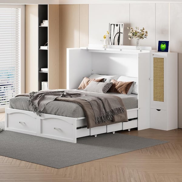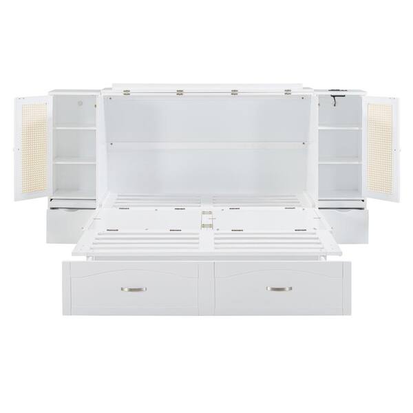 White Wood Frame Queen Murphy Bed with Drawers, 2 Cabinets, Sockets and USB Ports, Pulley Structure, Rattan Decoration