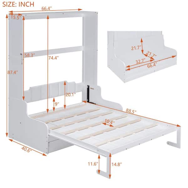 White Wood Frame Queen Size Murphy Bed, Wall Bed with Cushion, Folded Into a Cabinet with 2-Seat Chair, Headboard
