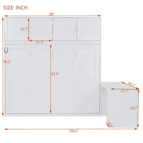 White Wood Frame Queen Size Murphy Bed Wall Bed with Desk, Cabinets, Shelves