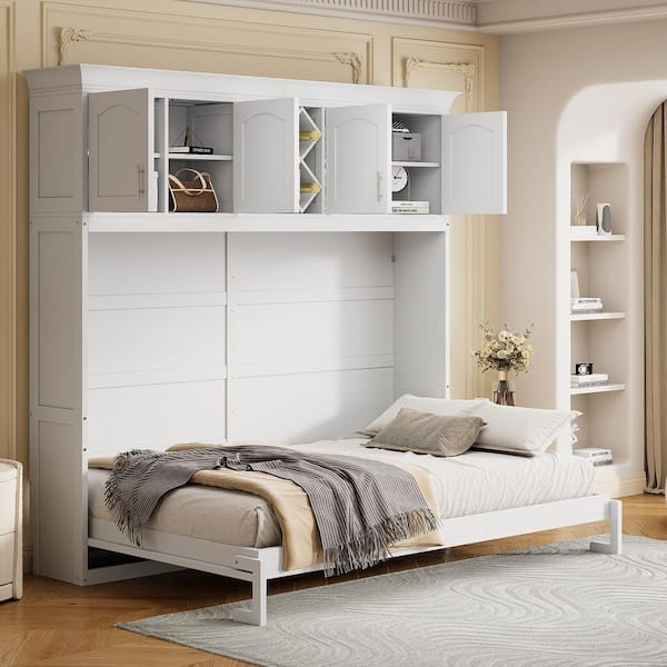 White Wood Frame Queen Size Murphy Bed Wall Bed with Top Cabinets and Wine Rack