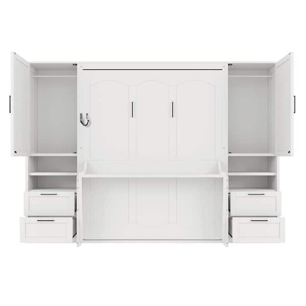 White Wood Frame Queen Size Murphy Bed with Closet, Drawers and Shelves