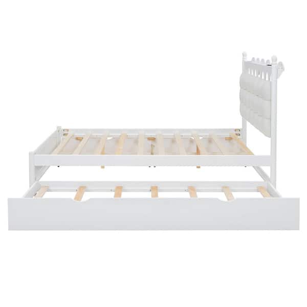 White Wood Frame Queen Size Velvet Upholstered Platform Bed with 2 Drawers, Twin Trundle, Sockets and USB Ports