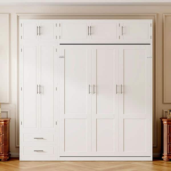 White Wood Frame Queen Size Wall Murphy Bed with Top Cabinet, Shelves and Wardrobe