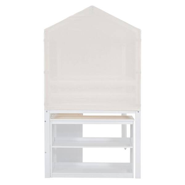 White Wood Frame Twin Size House Loft Bed with Movable Desk, 2 Open Compartments, Bookshelf, 3-Drawer and Tent