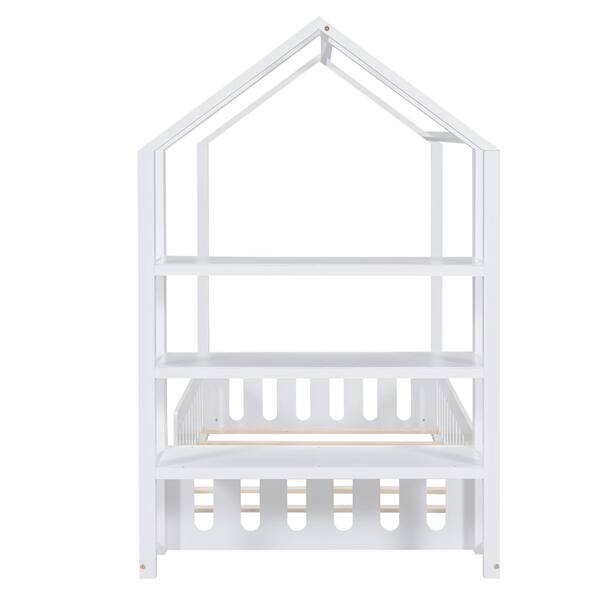 White Wood Frame Twin Size House Platform Bed, Floor Bed with Fence Bedrails, Detachable Storage Shelves