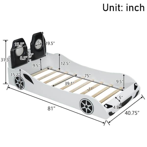 White Wood Frame Twin Size Race Car-Shaped Platform Bed with LED and PU Upholstered Backrest