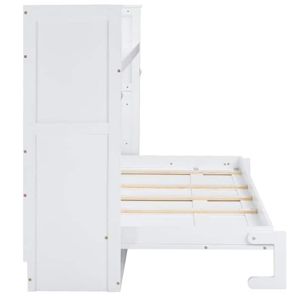 White Wood Frame Twin XL Murphy Bed with Desk, LED Light, USB Charging Station