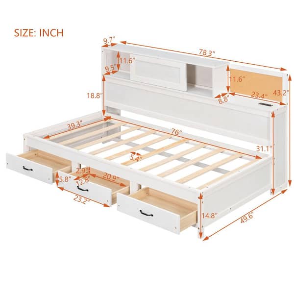 White Wood Twin Size Daybed with Storage Shelves, 3-Drawers, Cork Board, USB Ports, Slide-Door Compartment
