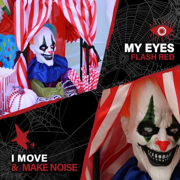 19 in. Battery Operated Hanging Animated Clown with Red LED Eyes Halloween Prop, Touch Activated, Speaks 5 Phrases