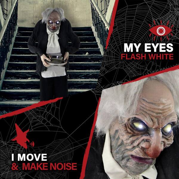 5 ft. Animatronic Moaning Butler Halloween Prop, Silver Candy Tray, Indoor/Covered Outdoors, Battery-Op, Rotates Head