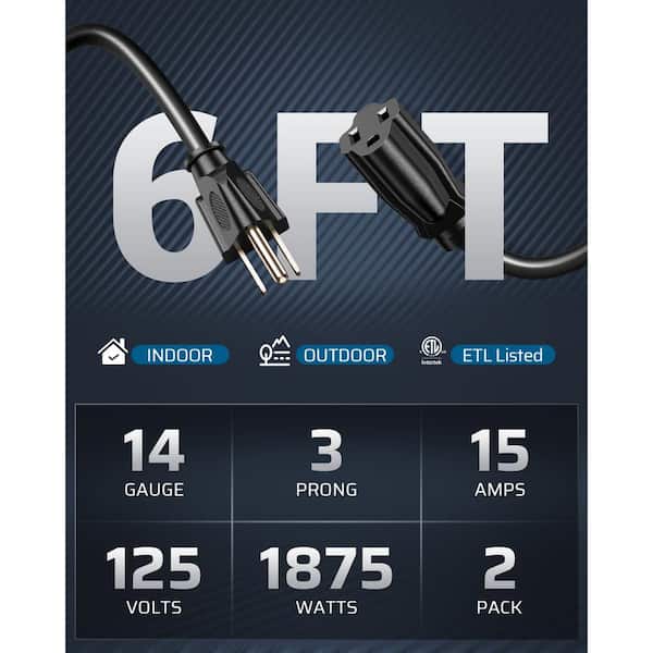 Heavy-Duty 6 ft. 14/3 SJTW Indoor/Outdoor Extension Cord with 3-Prong Outlets, 2-Pack, Black