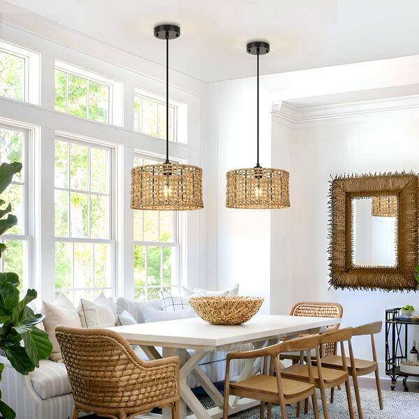 Jasslynn 60 Watt 1 Light Matte Black Modern Pendant Light with Drum Rattan Shade for Kitchen Bedroom, No Bulbs Included