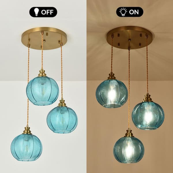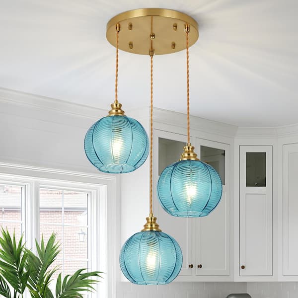 Kinlea 3 Light Blue Cluster Chandeliers with Globe Striped Glass Shape Hanging Pendant Lights with No Bulbs Included