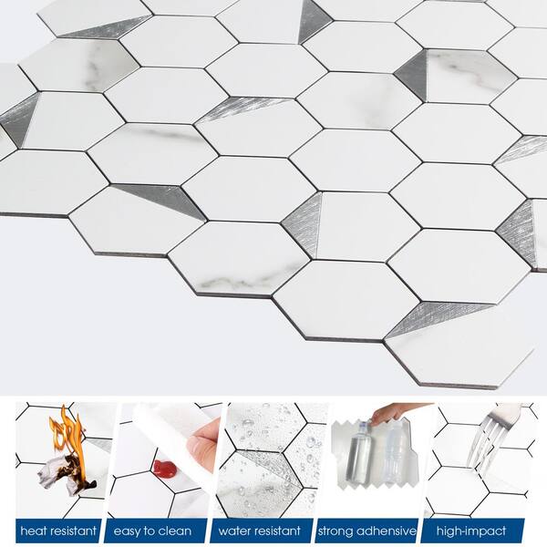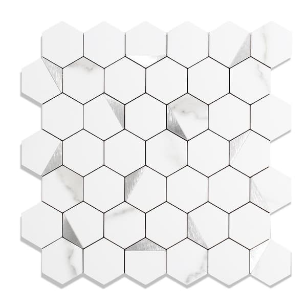 Hexagon Marble White Mixed Silver Metal 12 in. x 12 in. PVC Peel and Stick Backsplash Wall Tile (20 sq.ft./20-Sheets)