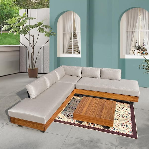 Alden 4-Piece Teak and Aluminum Outdoor Patio Sectional Sofa Set with Acrylic Cast Ash Cushions and Coffee Table