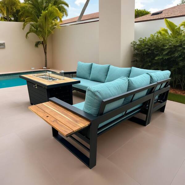 Denver 5-Piece Black Aluminum Outdoor Patio Fire Pit Deep Sectional Seating Set with Cast Breeze Cushions