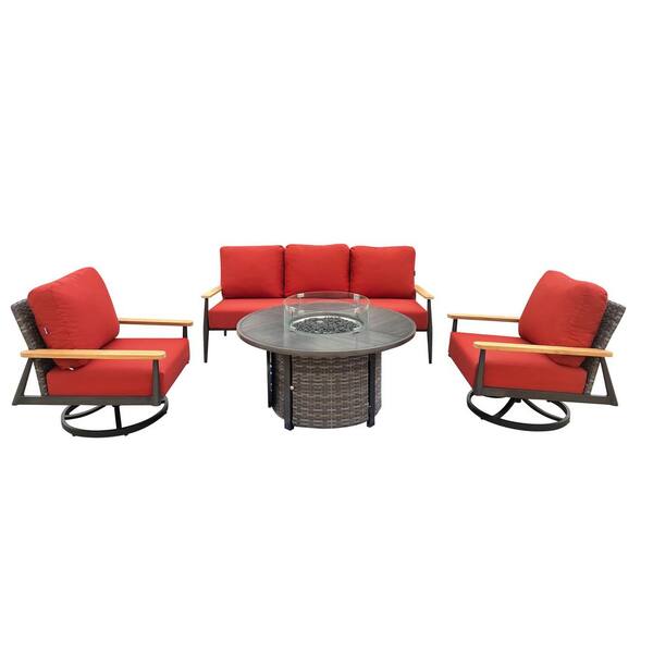 Manbo 4-Piece Wicker Patio Fire Pit Seating Set with Sunbrella Canvas Terracotta Cushions and Round Fire Pit Table