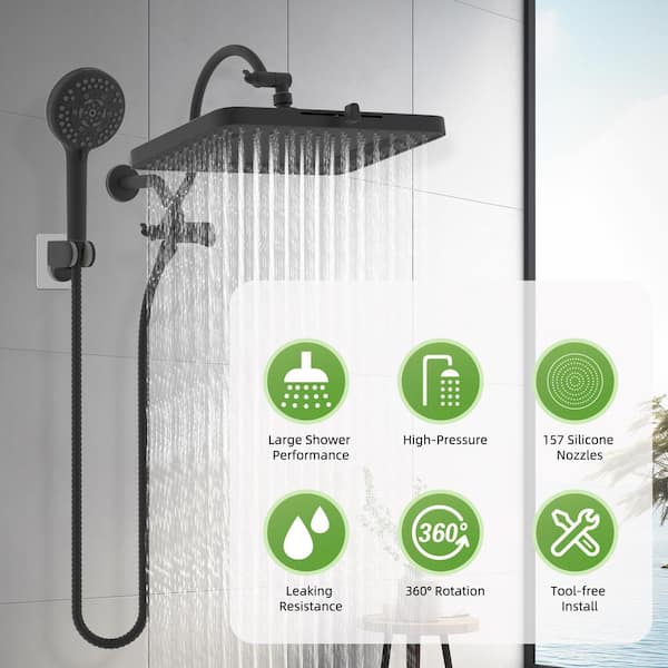 5-Spray 13 in. Dual Wall Mount Fixed and Handheld Shower Head 1.8 GPM in Matte Black with 12 in. Extension Arm