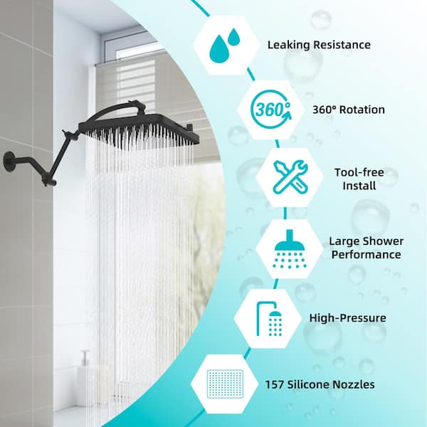 5-Spray Patterns w/ 1.8 GPM 13 x 10 in. Wall Mount Rain Fixed Shower Head w/ 16 in. Shower Extension Arm in Matte Black