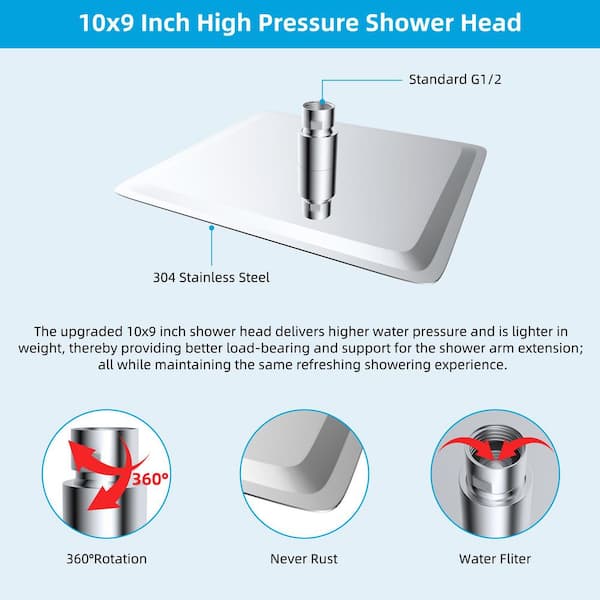 • 10 in. x 9 in rain shower head with 110 splash jets