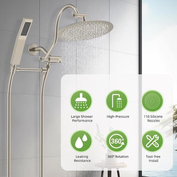 Rainfall 1-Spray 10 in. All Metal Dual Wall Mount Fixed and Handheld Shower Head 1.8 GPM in Brushed Nickel Finish