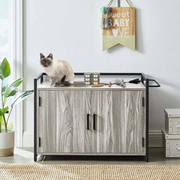 Hidden Cat Litter Box Furniture with Ventilation and Bench Seat, Pet Crate with Iron and Wood Sturdy Structure