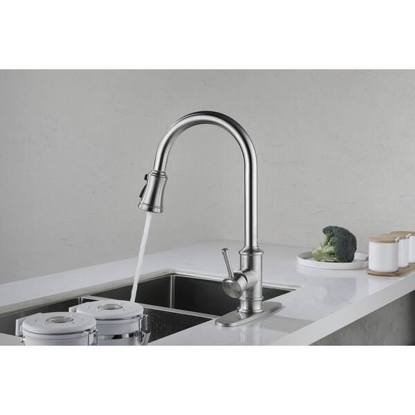 High Arc Single Handle Pull Out Sprayer Kitchen Faucet with 360° Swivel Spout and Deckplate Included in Brushed Nickel