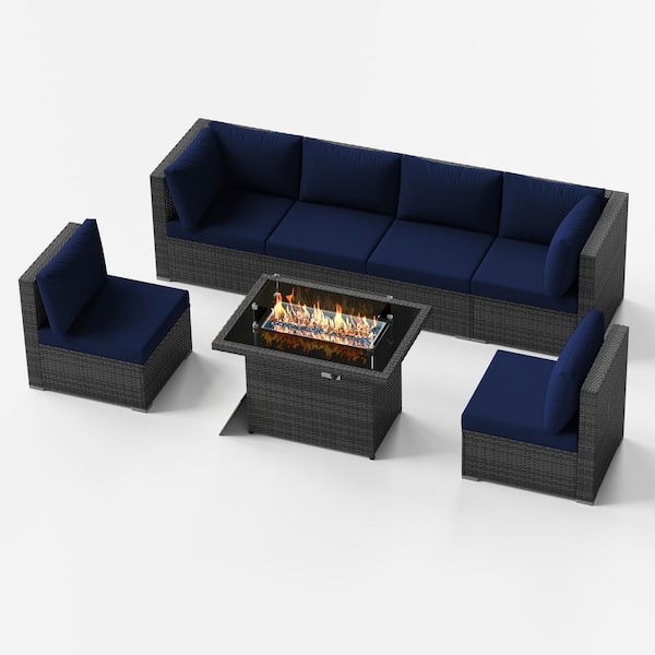 High Back Gray 7-Piece Wicker Patio Conversation Sectional Deep Seating Set with Fire Pit Table and Navy Blue Cushions